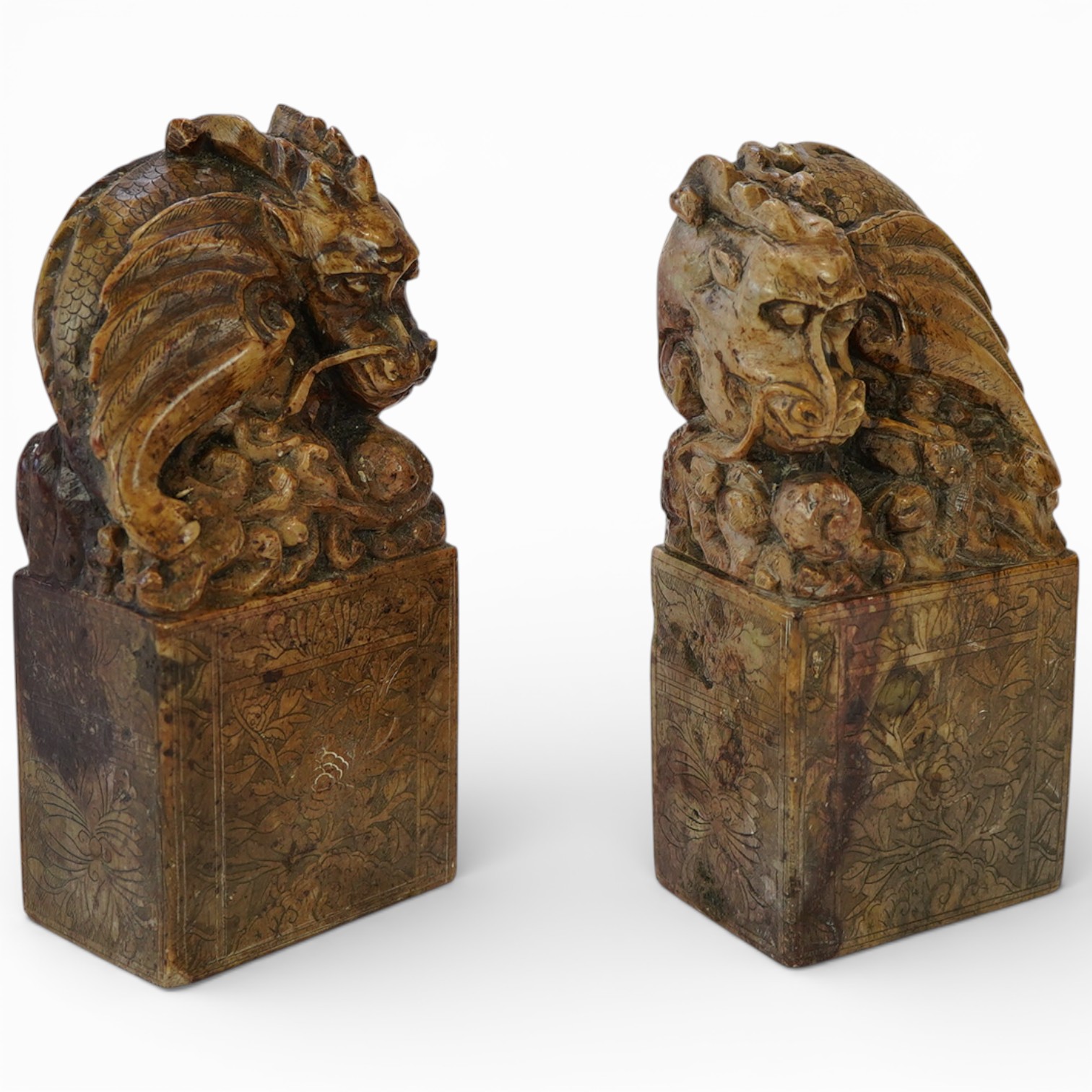 A pair of Chinese soapstone 'dragon' seals, height 19cm