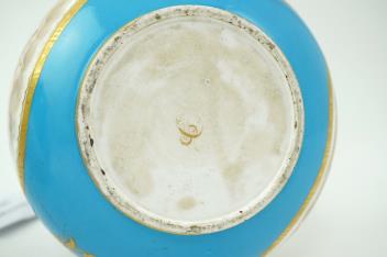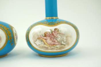 A pair of Coalport bottle vases, in Sevres style, c.1870, each painted with cherubs in a landscape and cherubs floating on a cloud, within gilt cartouches on a bleu celeste ground, gilt script initials mark, 22cm high
