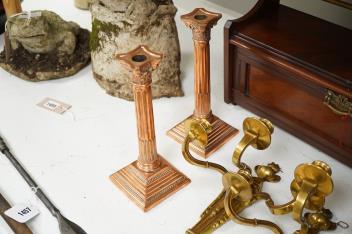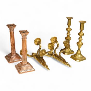 A pair of Corinthian column copper candlesticks, a pair of three branch sconces and pair of brass candlesticks, together with brass-mounted mahogany wall shelf /cabinet - 33cm high