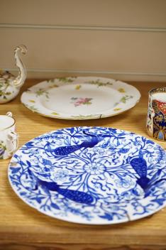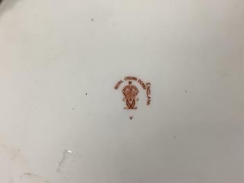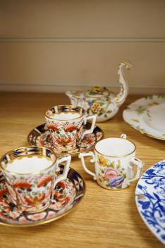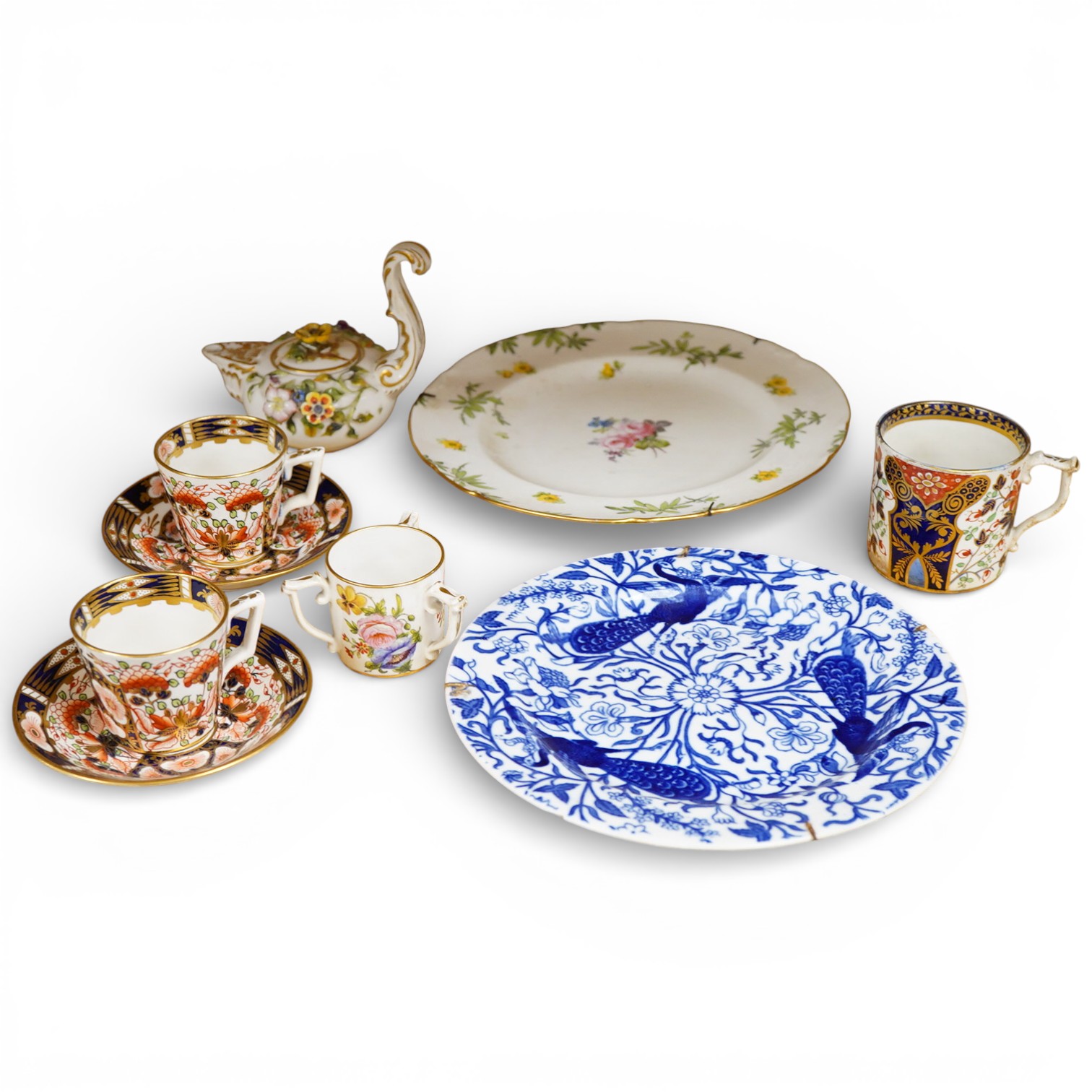 Lot 263 , A pair of Derby King Street coffee cups and saucers, similar encrusted inkwell and tyg, Royal Crown Derby plate and two other Derby items, inkwell 11cm