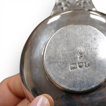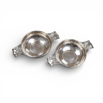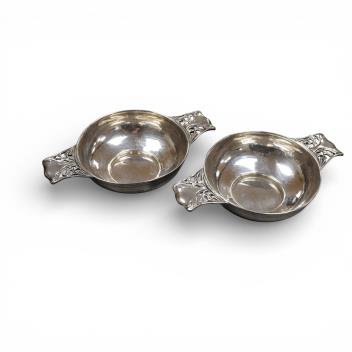 Lot 861 , A pair of Edwardian Art Nouveau silver quaich's, by W.G. Connell, London, 1901, with pierced lug handles, diameter 12.7cm over handles.