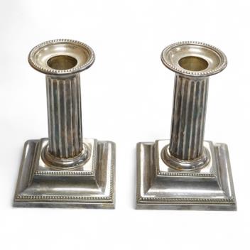 Lot 1830 , A pair of Edwardian silver mounted fluted column candlesticks, by Hawksworth, Eyre & Co, Sheffield, 1905/6, height 12cm, weighted.