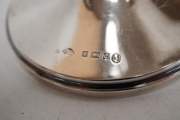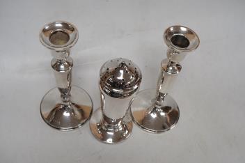 Lot 1834 , A pair of Elizabeth II silver mounted candlesticks, by Adie Brothers, Birmingham, 1952, height 16.6cm, together with a silver mounted sugar caster, also weighted.