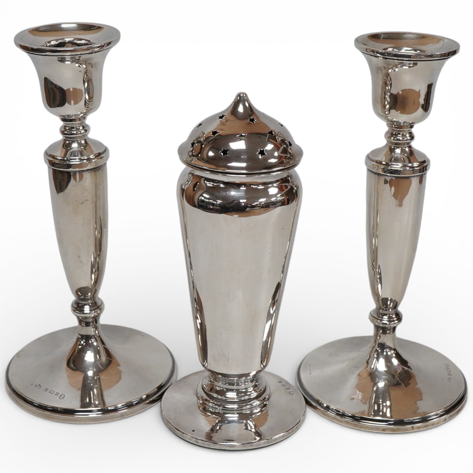 A pair of Elizabeth II silver mounted candlesticks, by Adie Brothers, Birmingham, 1952, height 16.6cm, together with a silver mounted sugar caster, also weighted.