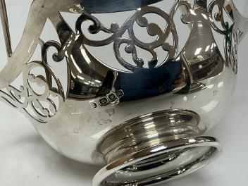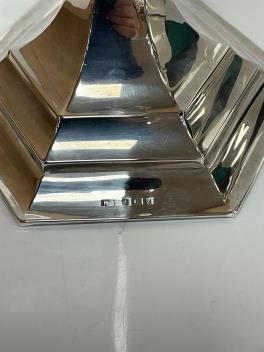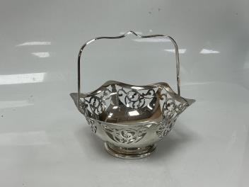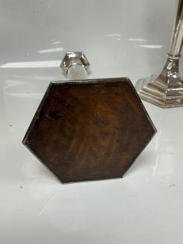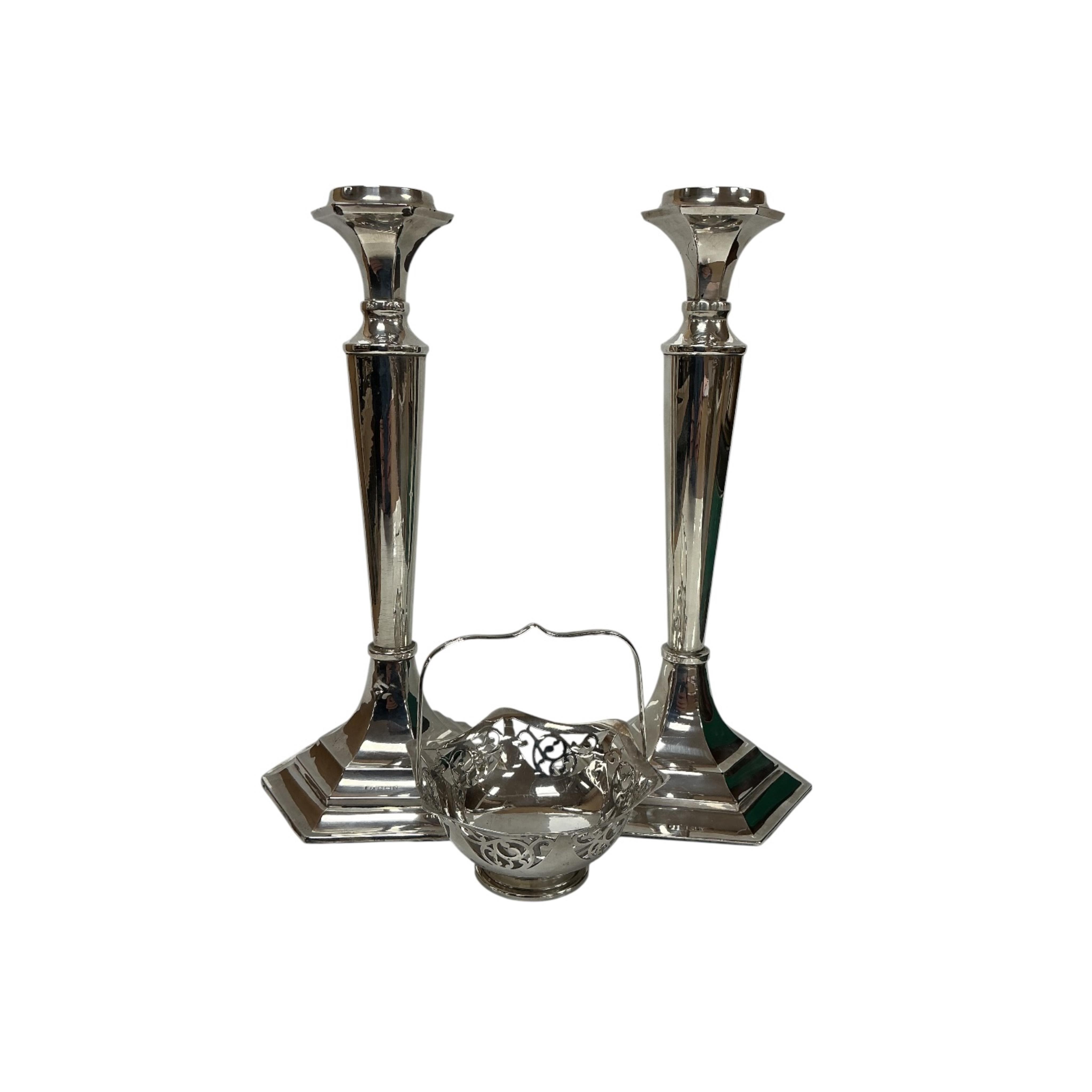 Lot 1827 , A pair of Elizabeth II silver mounted candlesticks, with tapering circular stems on hexagonal foot, William Adams Ltd, Birmingham, 1952, 29cm, weighted, together with a George V silver hexagonal epergne basket, London, 1