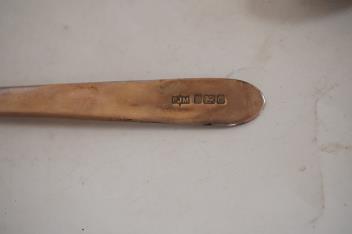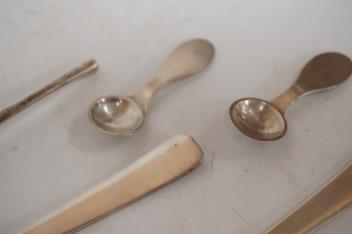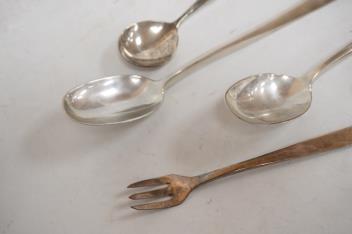 Lot 1002 , A pair of Elizabeth II silver rat tail spoons by Charles Kevin McGlue, London, 1979, 18cm, a silver pickle fork by Philippa Jane Merriman, Sheffield, 1988, a silver preserve spoon, maker PTP, London, 1985, a pair of smal