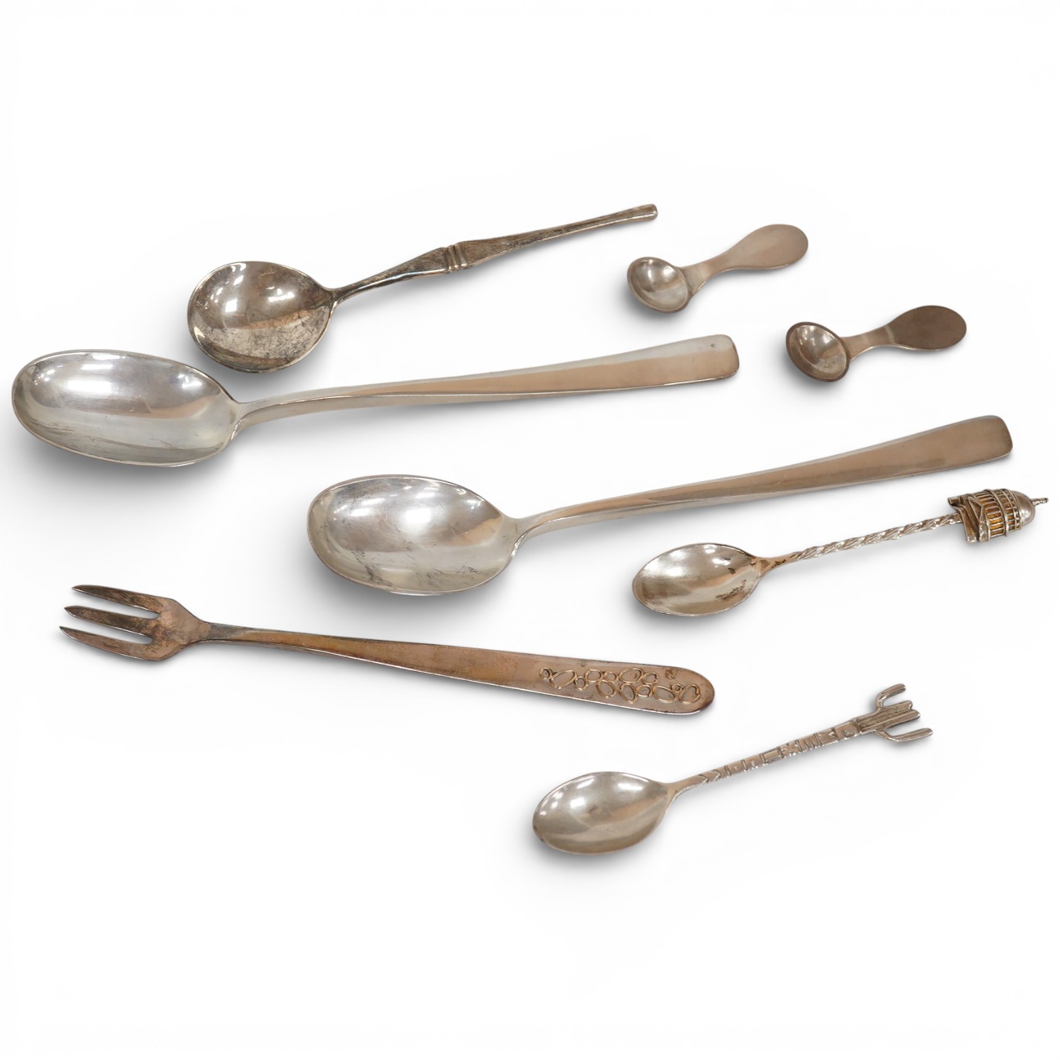 A pair of Elizabeth II silver rat tail spoons by Charles Kevin McGlue, London, 1979, 18cm, a silver pickle fork by Philippa Jane Merriman, Sheffield, 1988, a silver preserve spoon, maker PTP, London, 1985, a pair of small silver condiment spoons, maker BML, London, 1984, one unmarked, a silver commemorative spoon, maker VAS, London, 1982 and a continental spoon(a.f.).