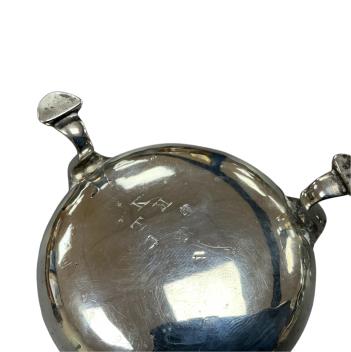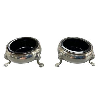 Lot 839 , A pair of George II silver bun salts, on three hoof feet, with blue glass liners and engraved initials, Edward Wood, London, 1743, diameter 58mm.