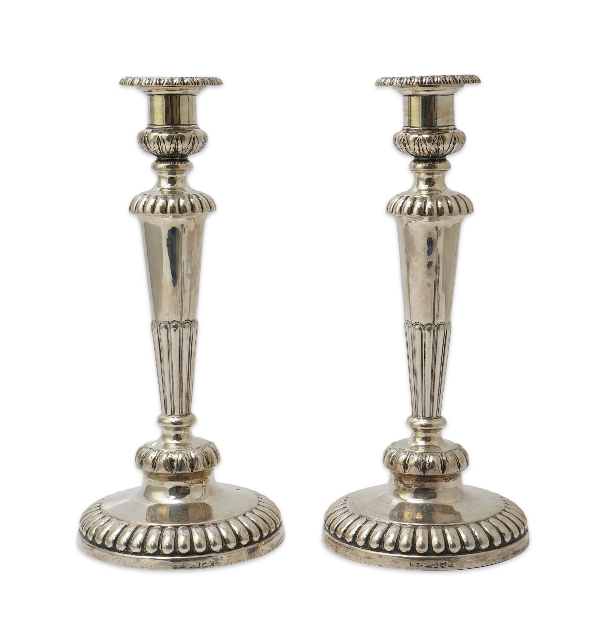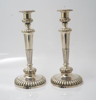 A pair of George III silver candlesticks, by John Roberts & Co, with demi-fluted tapering columns, on fluted circular foot, later drilled for electricity, Sheffield, 1811, height 31.8cm, weighted.