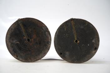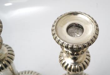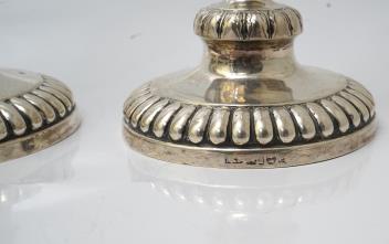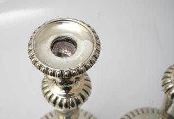 One stem leans very slightly. A few small dings to each stick, in places. Some wear to the decoration in places, commensurate with age and some use, mainly visible near to the base. Some rubbing to the hallmarks. Removeable sconces.