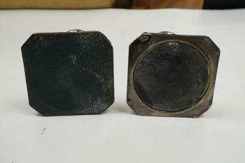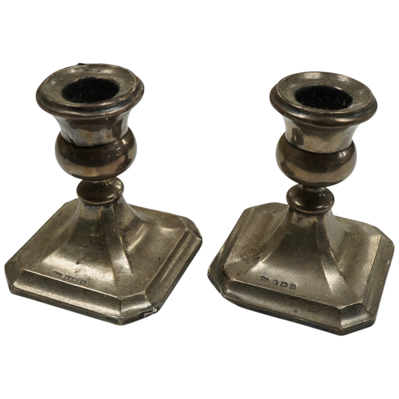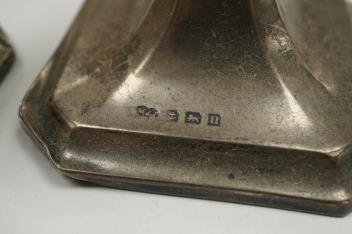 A pair of George V silver mounted dwarf candlesticks, Marson & Jones, Birmingham, 1919, 82mm, weighted.