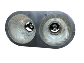 A pair of Holophane double industrial factory lights, width 64cm, height 42cm