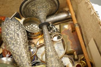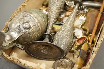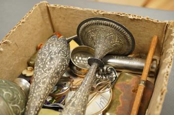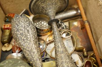 Lot 426 , A pair of Indian white metal spill vases, agate seal, eye glass and sundries, vases 17cm