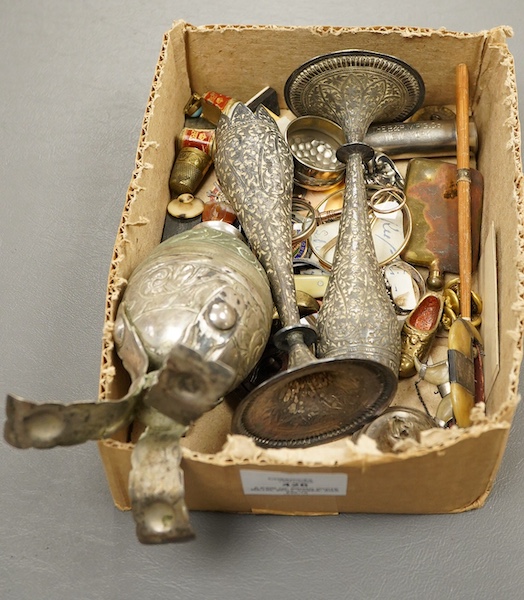 A pair of Indian white metal spill vases, agate seal, eye glass and sundries, vases 17cm