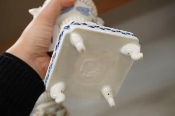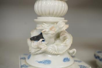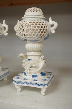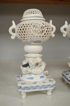 Lot 1111 , A pair of Japanese Hirado blue and white reticulated urns and covers decorated in relief with dragons, 20cm high