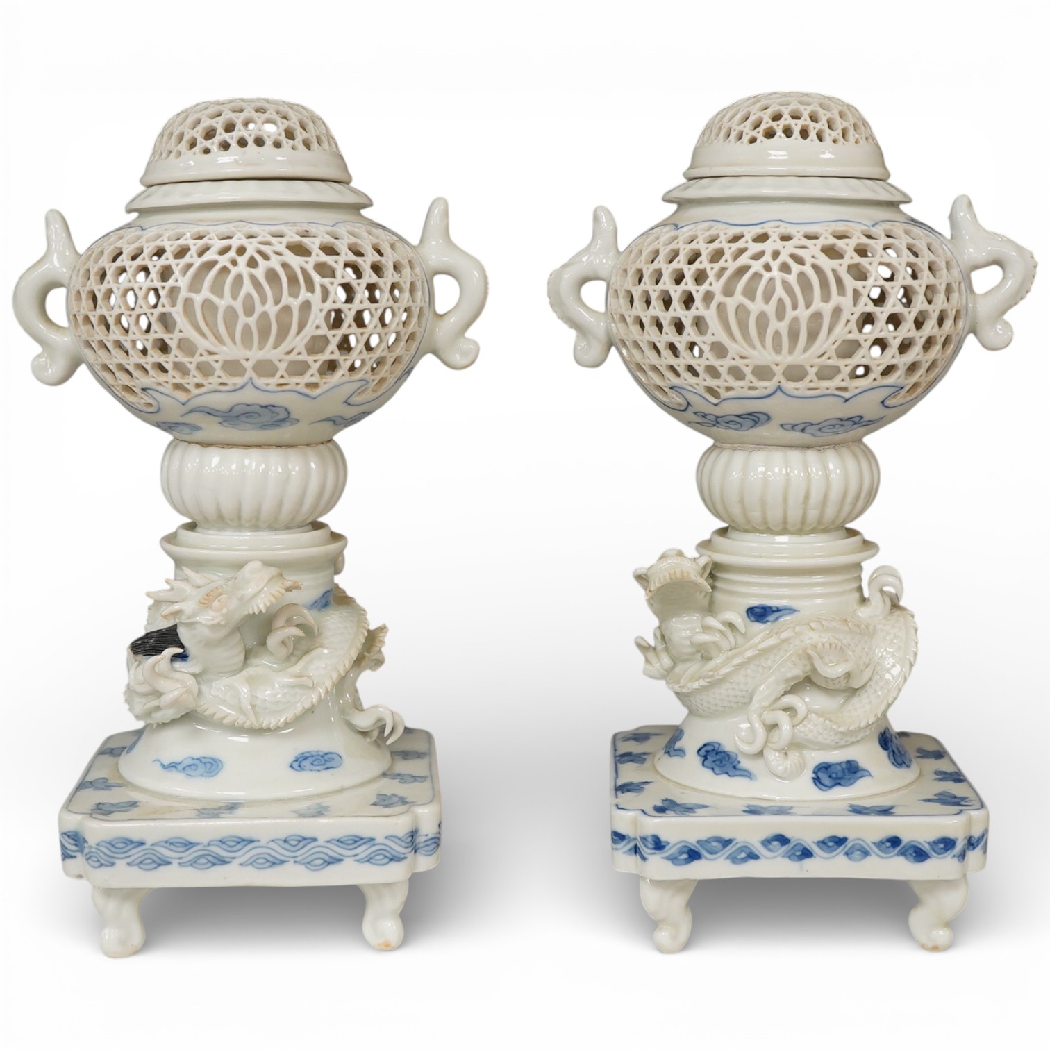 A pair of Japanese Hirado blue and white reticulated urns and covers decorated in relief with dragons, 20cm high