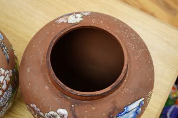 A pair of Japanese enamelled terracotta jars, c.1900, 26cm high. Condition - fair to good