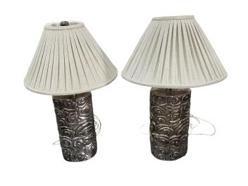 A pair of Robert Kuo Collection McGuire repousse table lamps with quilted shades, height 78cm