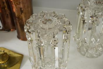 A pair of Victorian clear glass table lustres with drops, 20cm high
