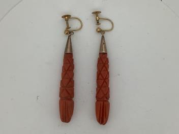 Lot 926 , A pair of Victorian coral drop earrings, late 19th century, each composed of elongated coral drops carved with stylised foliate designs, to later screw fittings, length approximately 5.9cm