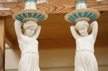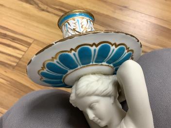 One figure with candletray glue re-attached to the head with glue residue showing, image 5. Other figure with both forearms and hands professionally restored, image 6. Both with some wear to gilding. Unsigned.