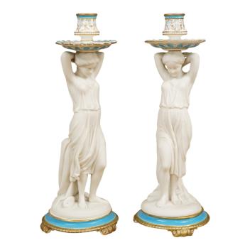 Lot 251 , A pair of Victorian glazed and bisque porcelain figural candlesticks, 34cm high