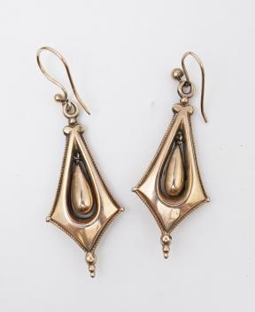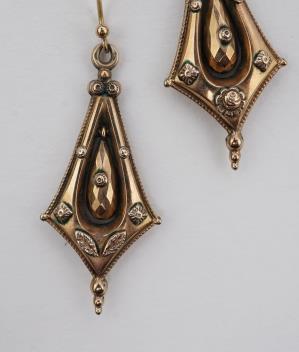 Lot 3023 , A pair of Victorian gold earrings, late 19th century, each of drop design, outlined with a rope twist border and accented with floral and foliate motifs, the centres suspending faceted pendants, length 5.8cm, one slightl