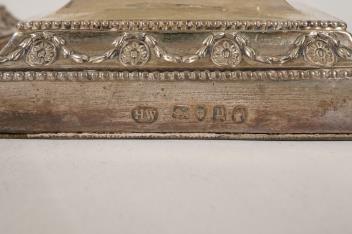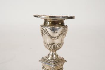 The weighted base has sprung slightly on one stick and there are a few knocks to the silver around the base rim. There are also two small dents to the neck. There are similar issues regarding small dings to the other stick, but less prominent. Hallmarks clear but with some slight rubbing to one maker's mark.