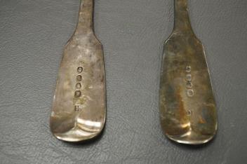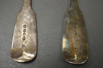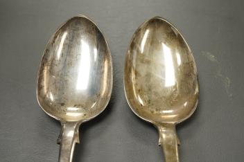 Lot 2855 , A pair of Victorian silver fiddle pattern basting spoons by Joseph & Albert Savory, London, 1846, with engraved initials, 30cm, 10oz.