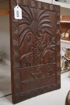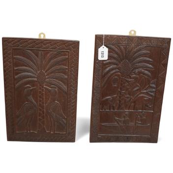 Lot 1313 , A pair of West African carved panels depicting palm trees, figures and birds, largest 46 x 29cm