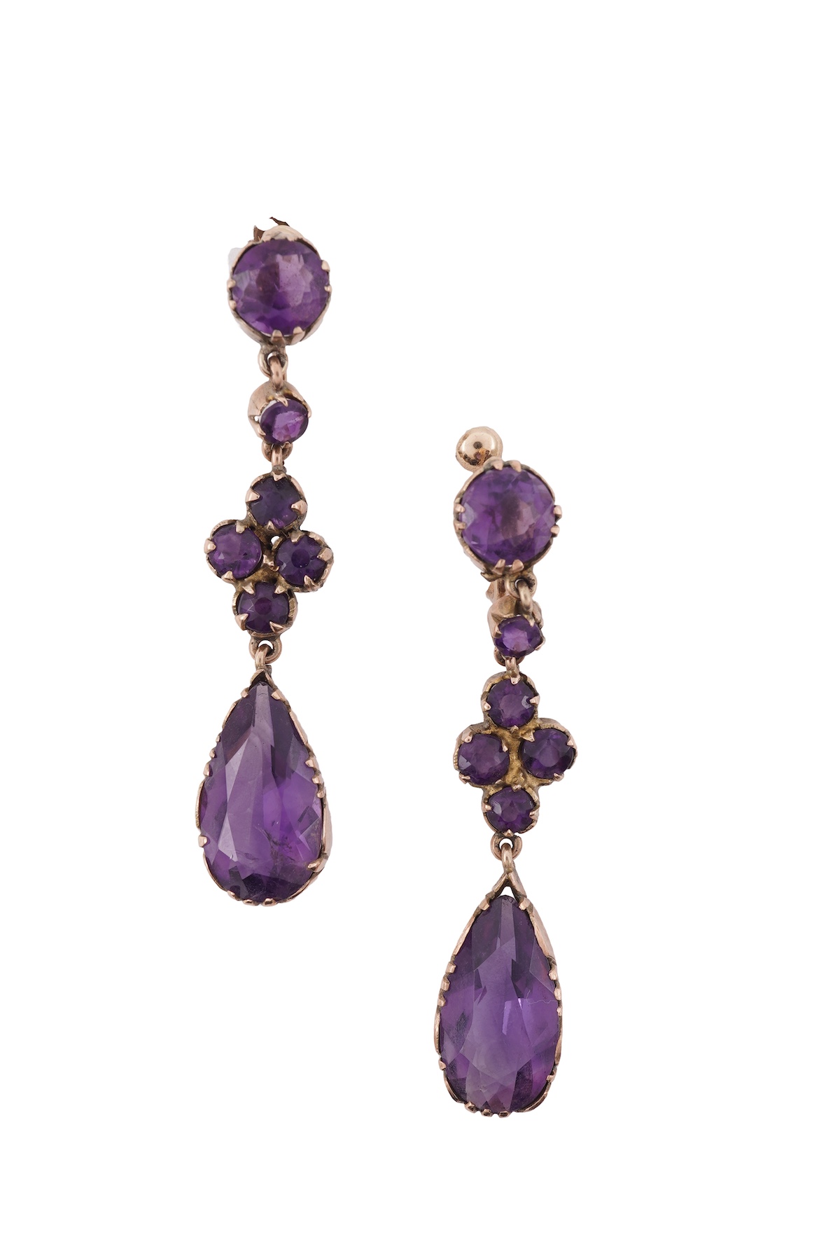 A pair of amethyst earrings, circa 1900, of pendant design, each composed of circular-cut amethyst links suspending pear-shaped amethyst drops, mounted in gold, screw fittings, length 4.5cm each