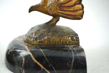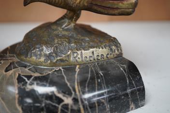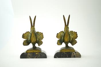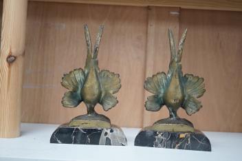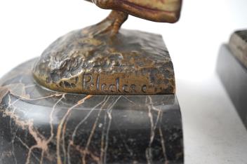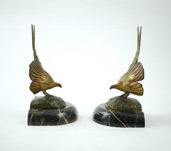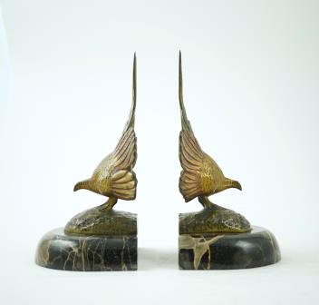 Lot 1296 , A pair of bronze peacock bookends, with remains of coloured pigments, marble plinths, signed R. Leclerc, 20cm