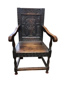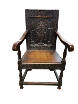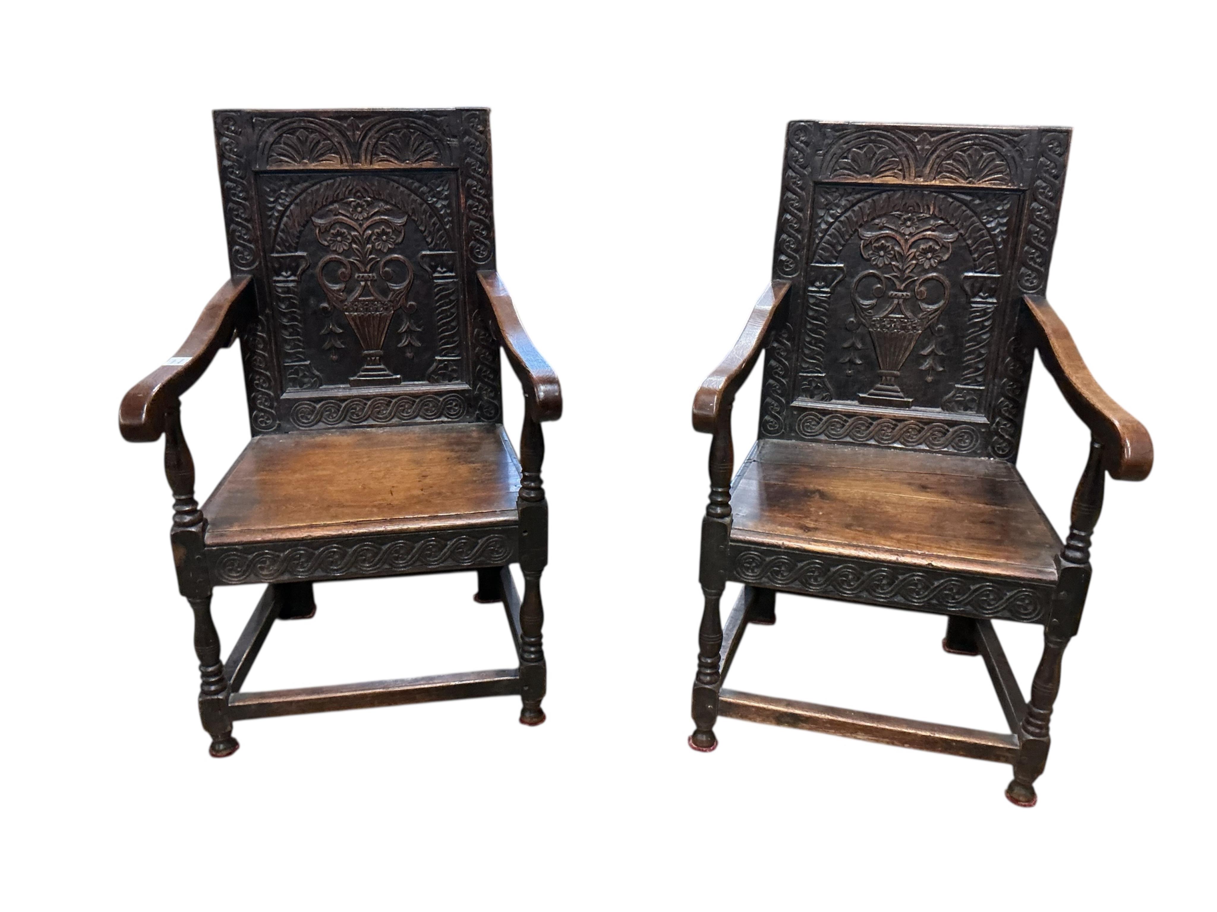 Lot 1271 , A pair of carved oak panel back armchairs, in Charles II style, incorporating old timbers, width 61cm, depth 62cm, height 104cm