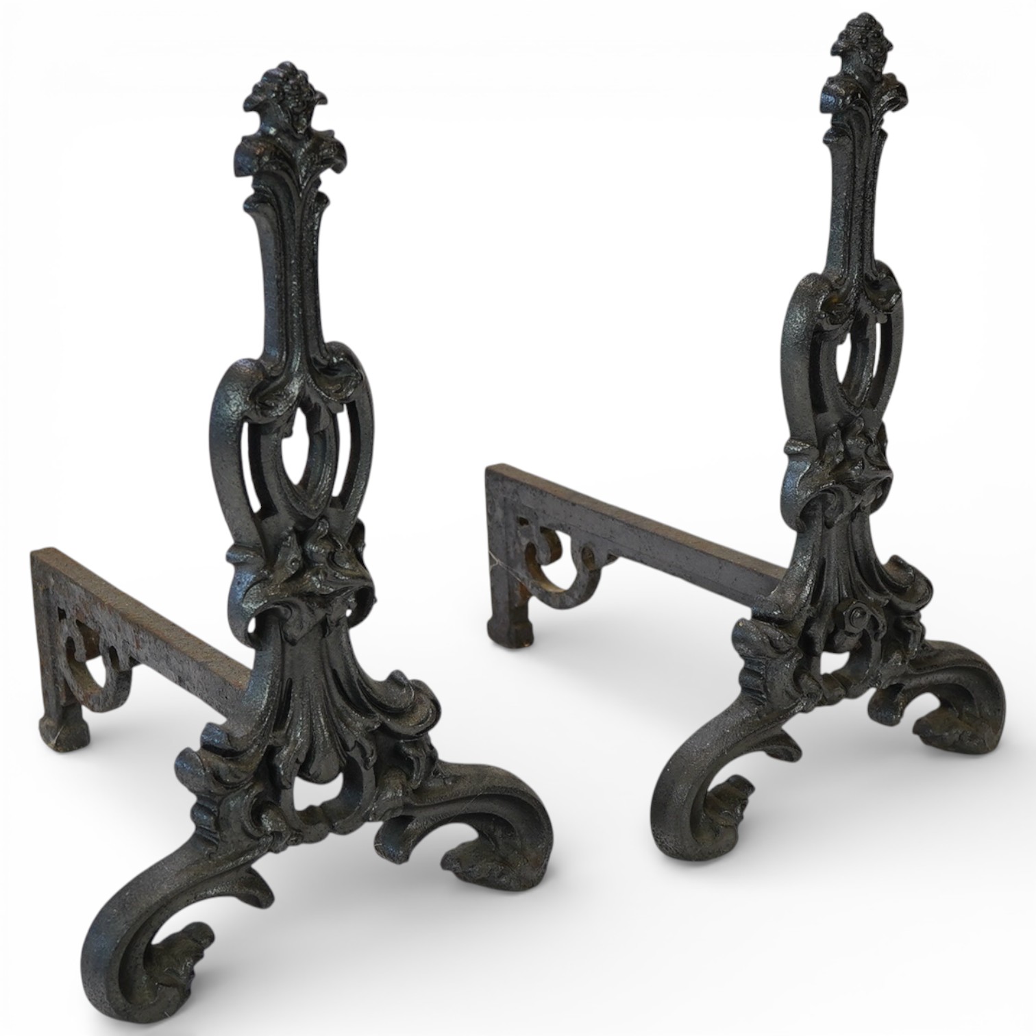 A pair of cast iron fire dogs, 53cm high