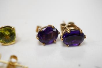 Lot 925 , A pair of chequerboard cut peridot set 18ct stud earrings, a pair of amethyst set 9ct stud earrings and three costume pairs of earrings.