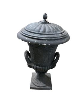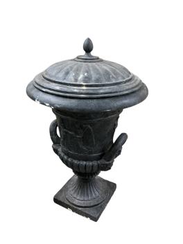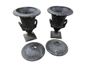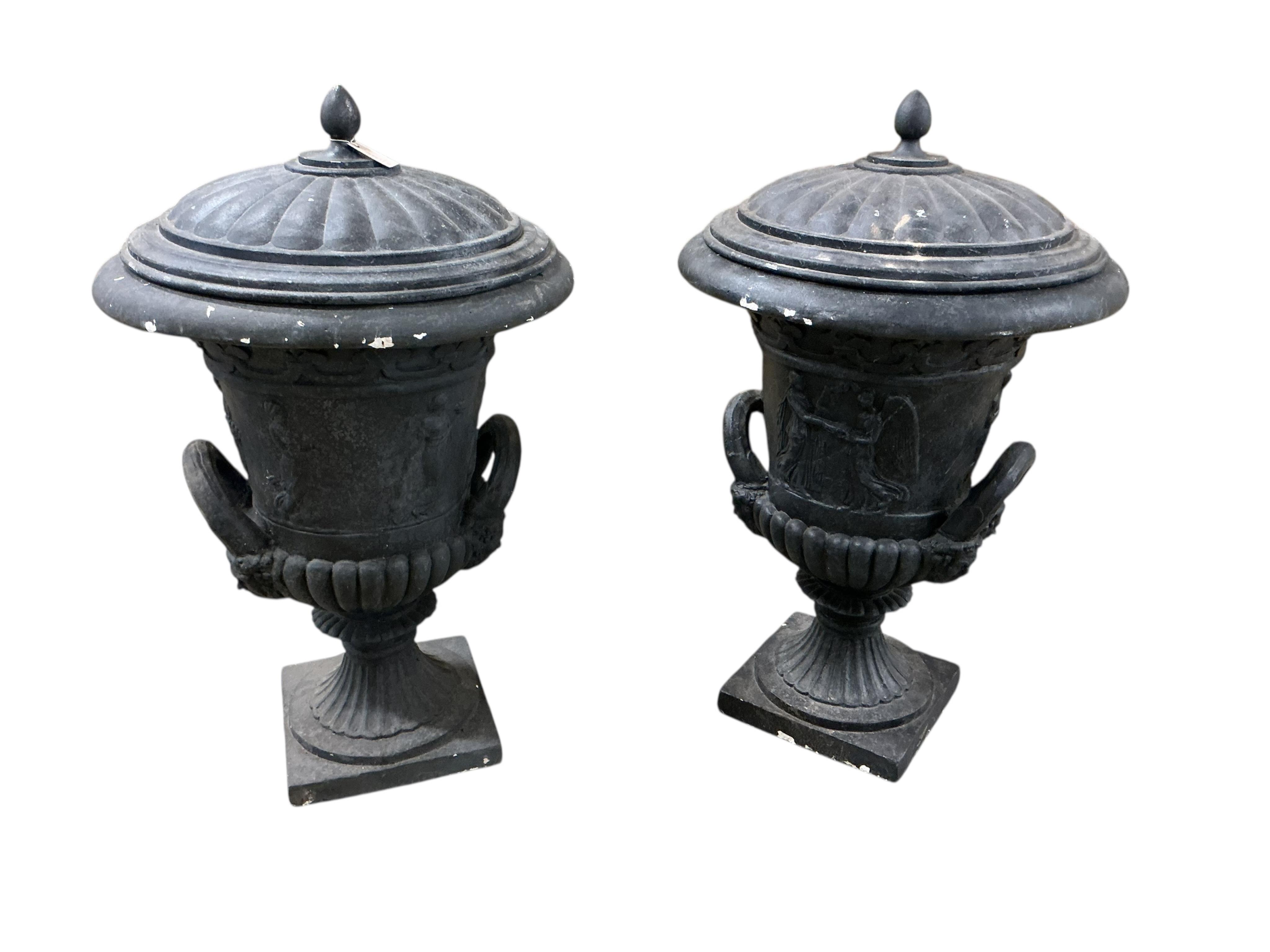 A pair of composite faux cast iron campana-shaped urns and covers, diameter 80cm, height 115cm