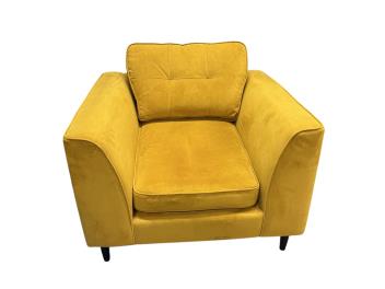 A pair of contemporary OKA mustard velvet lounge chairs, width 104cm, depth 96cm, height 78cm