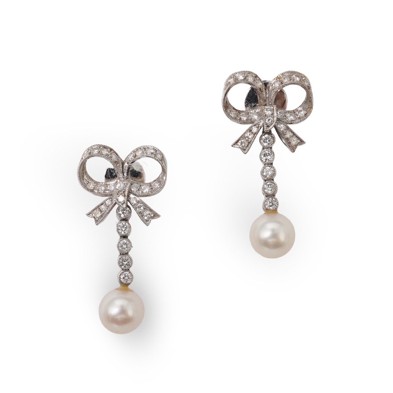 A pair of cultured pearl and diamond earrings, each designed in the Belle Epoque style, composed of ribbon bows suspending an articulated line of links, millegrain-set with brilliant-cut diamonds totalling approximately 1.00 carat, each terminating in a cultured pearl drop, length 3cm each, post fittings, combined gross weight approximately 6 grams