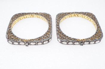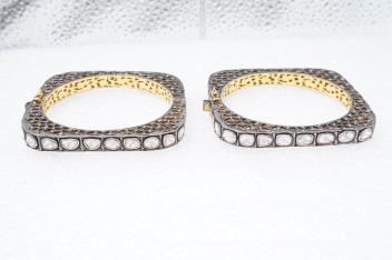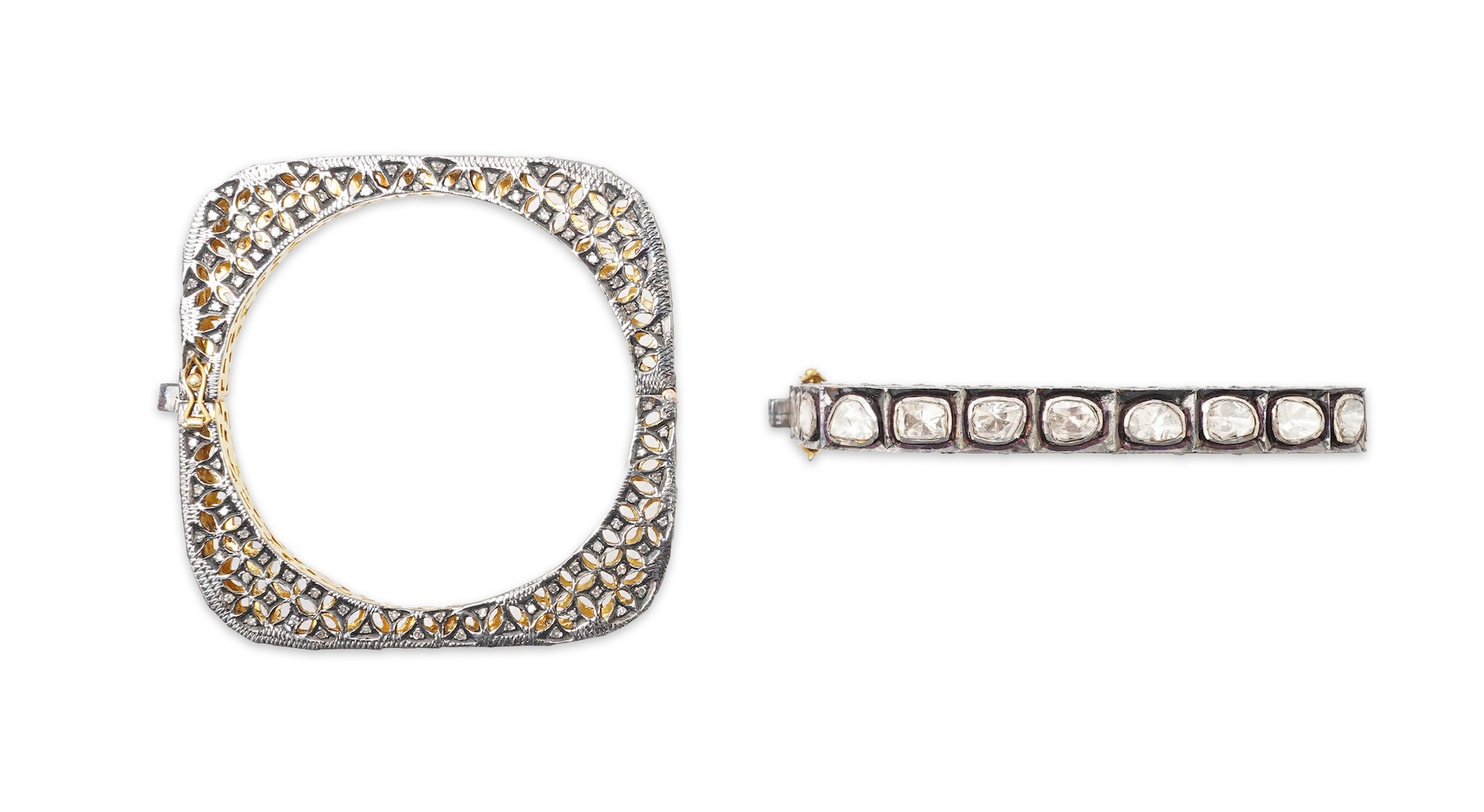 A pair of diamond bangles, India, each of hinged design and square outline, set with polki diamonds in foiled settings, the galleries of openwork design, set with circular-cut diamonds, mounted in silver, inner circumference approximately 17.5cm each, combined gross weight approximately 85 grams