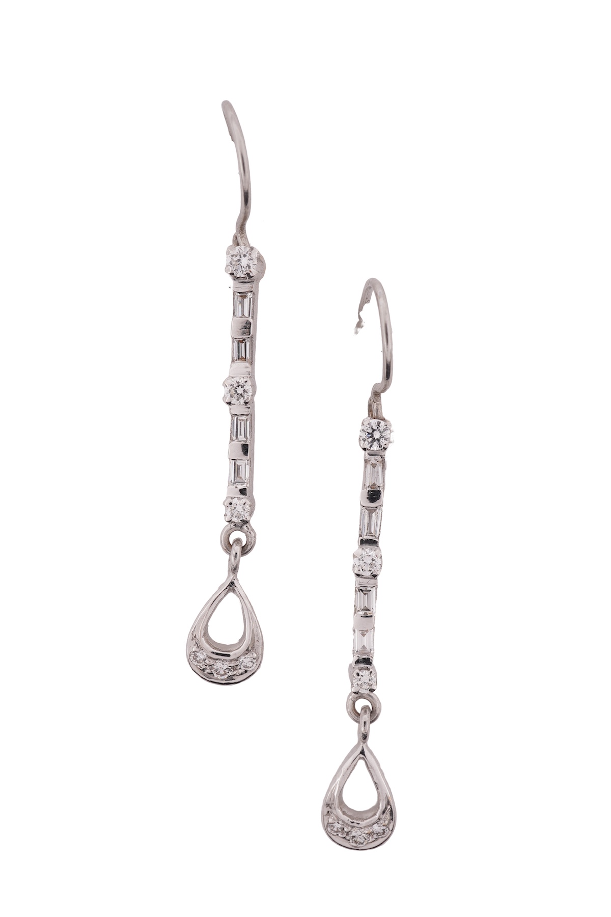 A pair of diamond earrings, each of pendant design, set with brilliant-cut and baguette diamonds totalling approximately 0.60 carats, length approximately 4.2cm each, hook fittings, combined gross weight approximately 3.3 grams