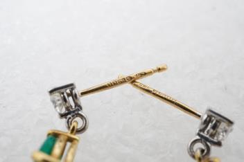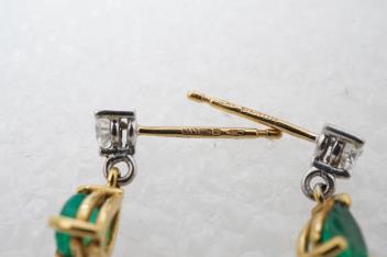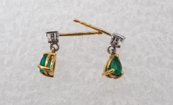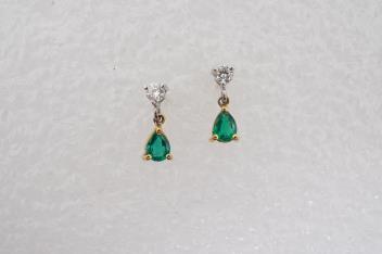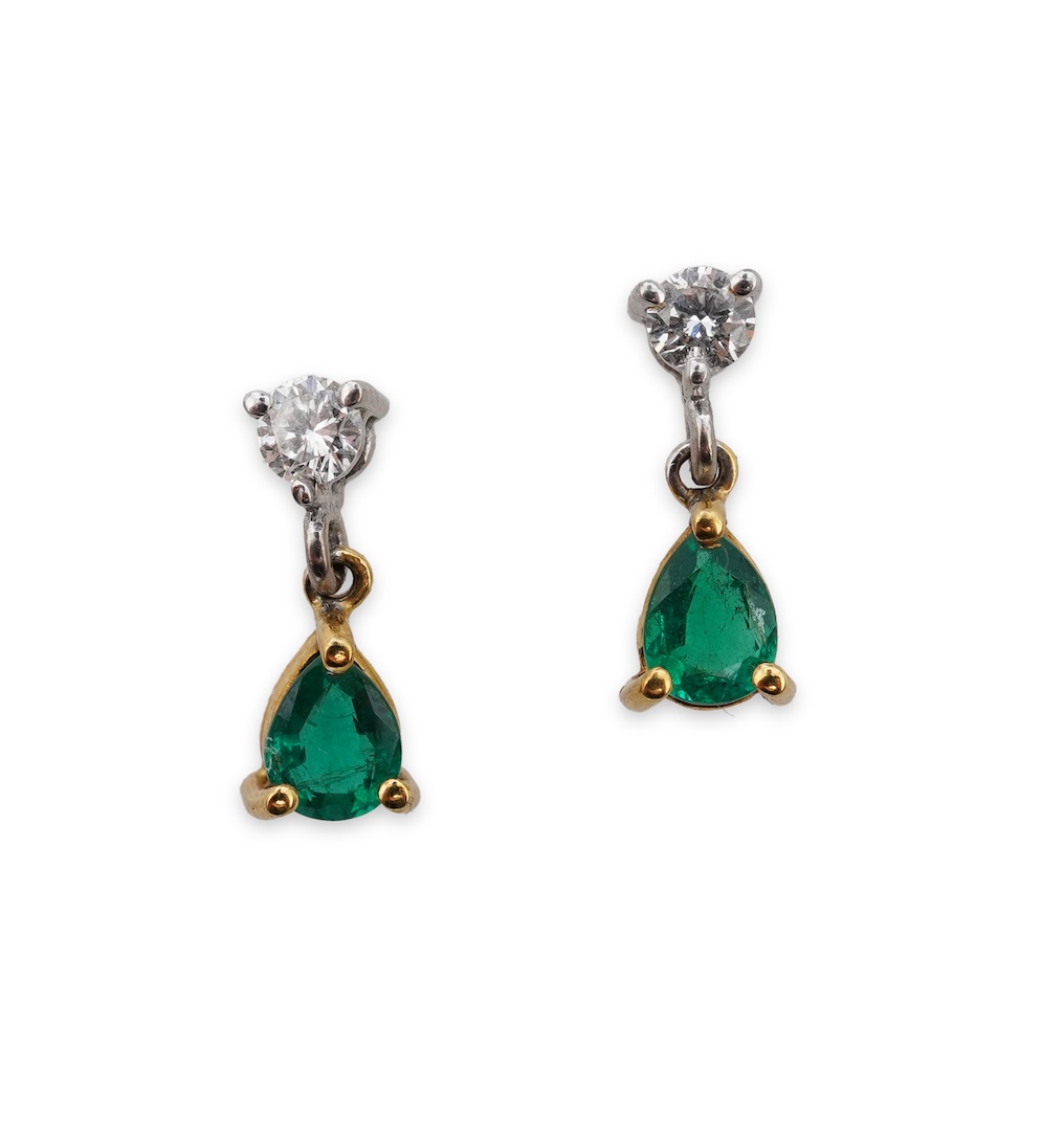 A pair of emerald and diamond earrings, of pendant design, each composed of a brilliant-cut diamond weighing approximately 0.10 carats, suspending a pear-shaped emerald drop, mounted in 18ct gold, length 1.2cm each, post fittings, British hallmarks