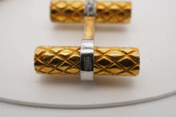 Lot 1170 , A pair of gold and diamond cuff links, each composed of two gold batons engraved with trellis designs, accented with brilliant-cut diamonds, in bicoloured gold, length 2.2cm, stamped 585, combined gross weight approximat