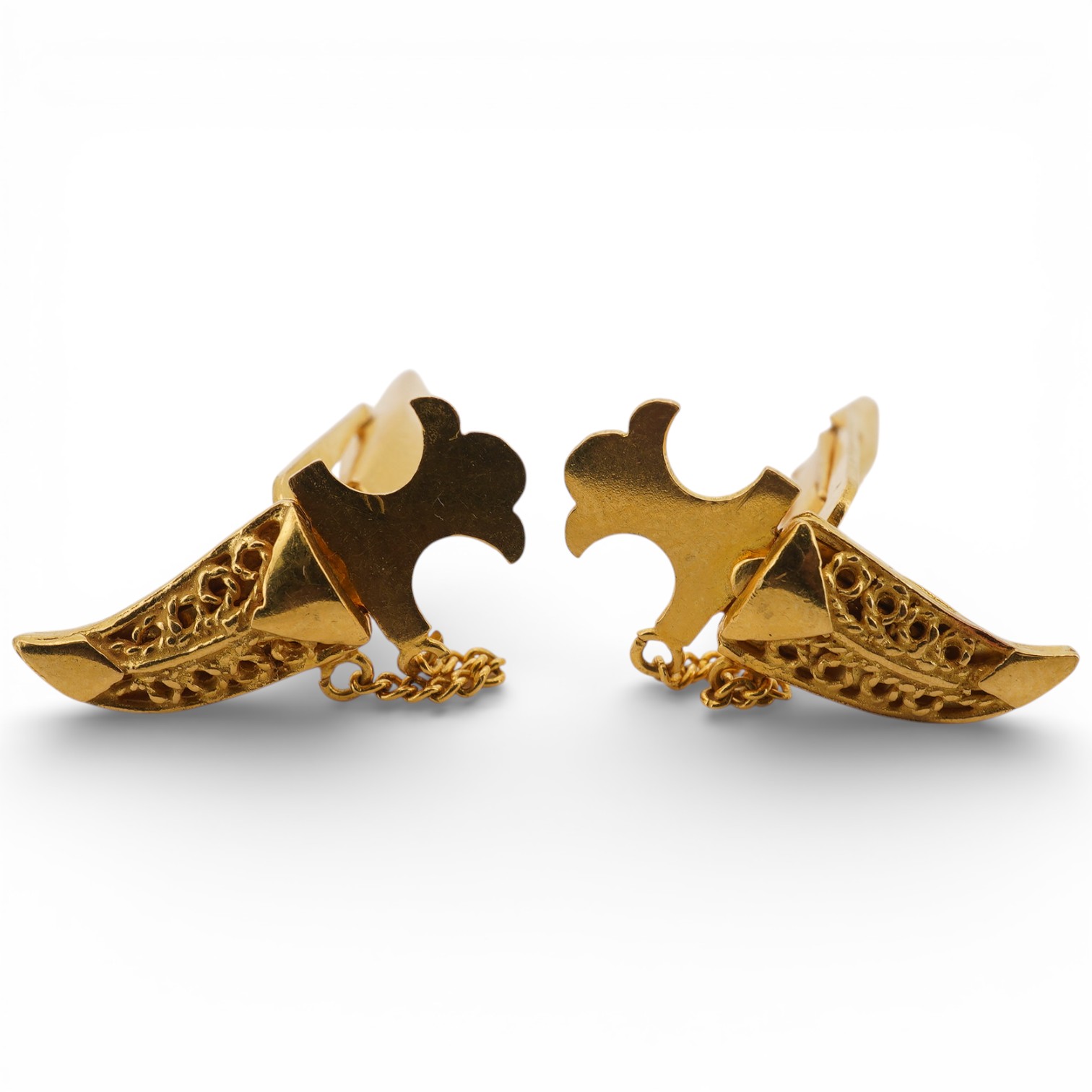 A pair of gold cufflinks, Middle Eastern, each designed as a 'jambiya' dagger in sheath, in gold, length 2.4cm, assay marks, stamped 875, combined gross weight approximately 10.5 grams