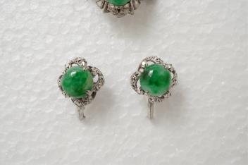 A pair of jadeite earrings and a ring, each set with a cabochon jadeite within polished mounts imitating diamonds, mounted in white gold, ring size M1/2, earrings 1.5cm each, screw fittings, combined gross weight approximately 9.5 grams