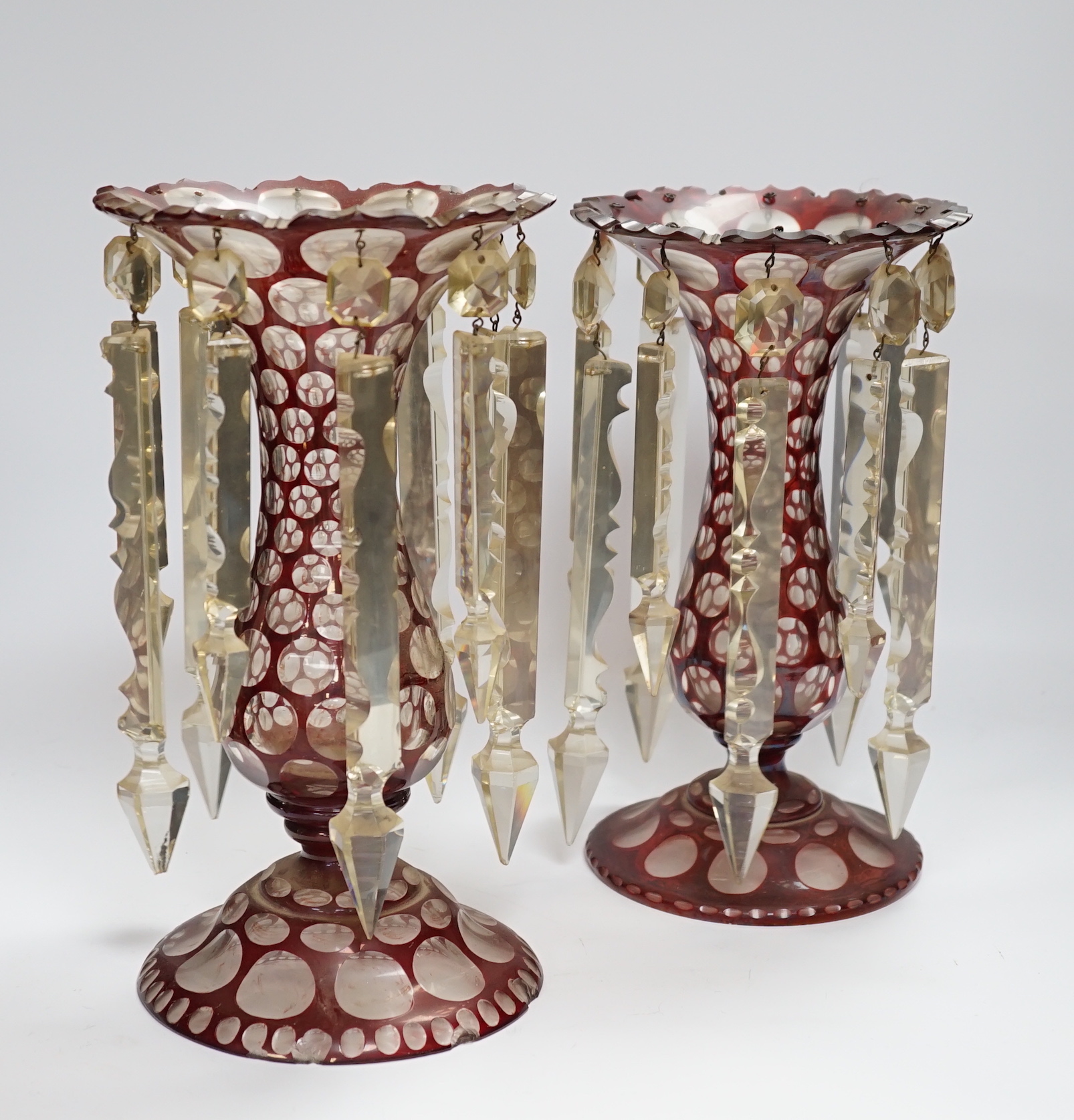 A pair of late 19th century Bohemian ruby flashed glass lustres, 30cm tall