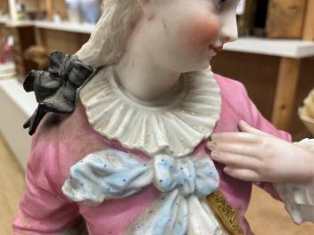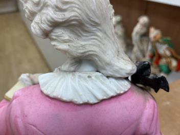 Very large chip under the lower arm of the female figure, as seen in additional photos. The same figure has a crack running from the outside of the base up to the decorated green area. The head has snapped of the male figure in the past and been repaired. Repair is noticeable.
