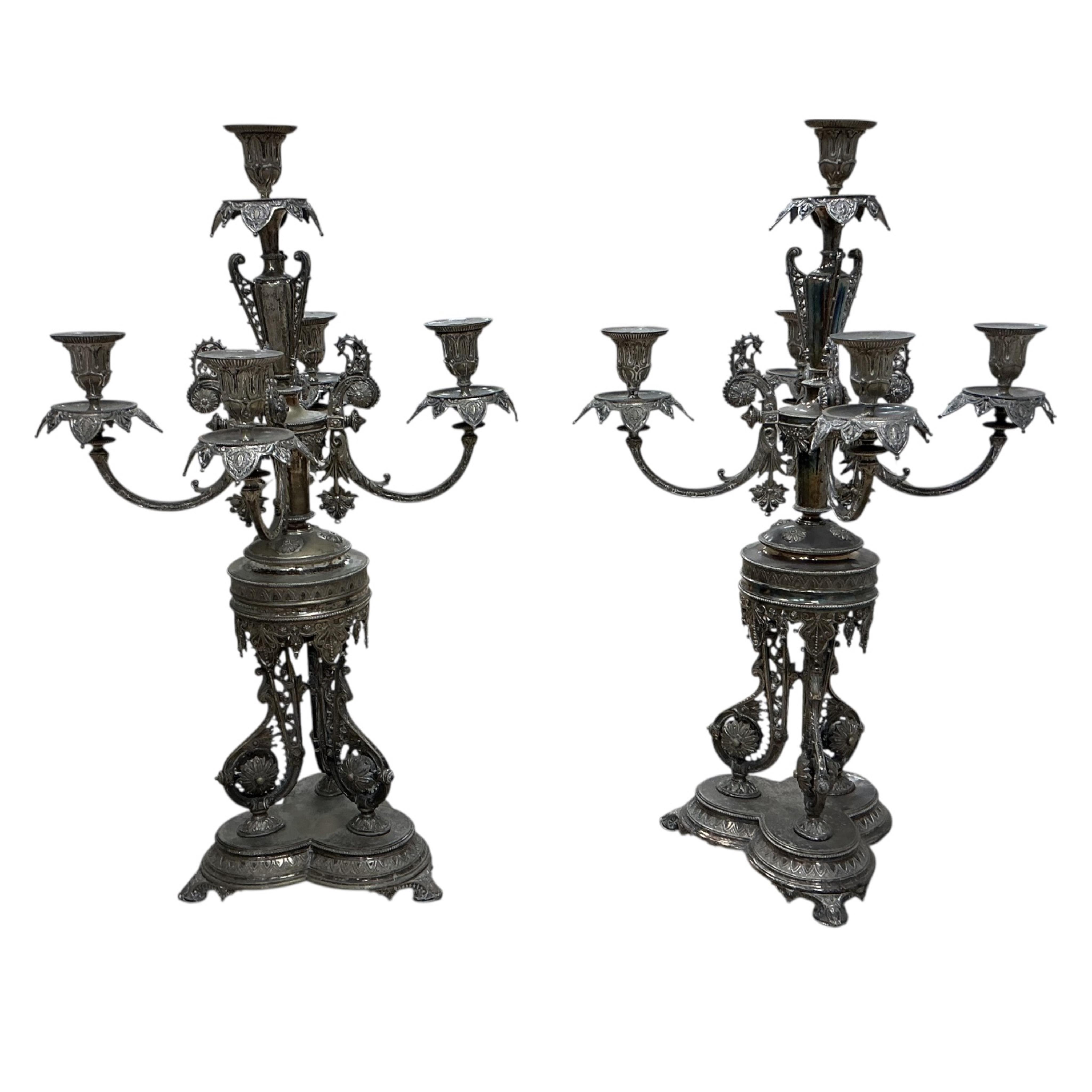 Lot 1514 , A pair of late Victorian ornate silver plated six branch candelabra by Woodwood & Co, 64cm high