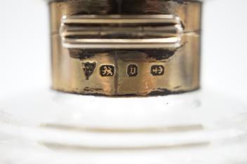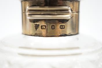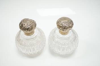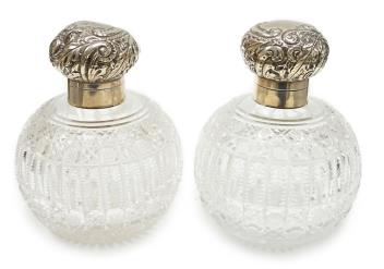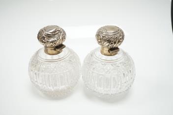Lot 820 , A pair of late Victorian silver mounted cut glass globular scent bottles (a.f.), Haseler Brothers, Birmingham, 1894/5, height 14.9cm.