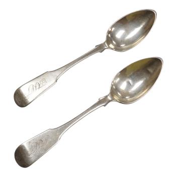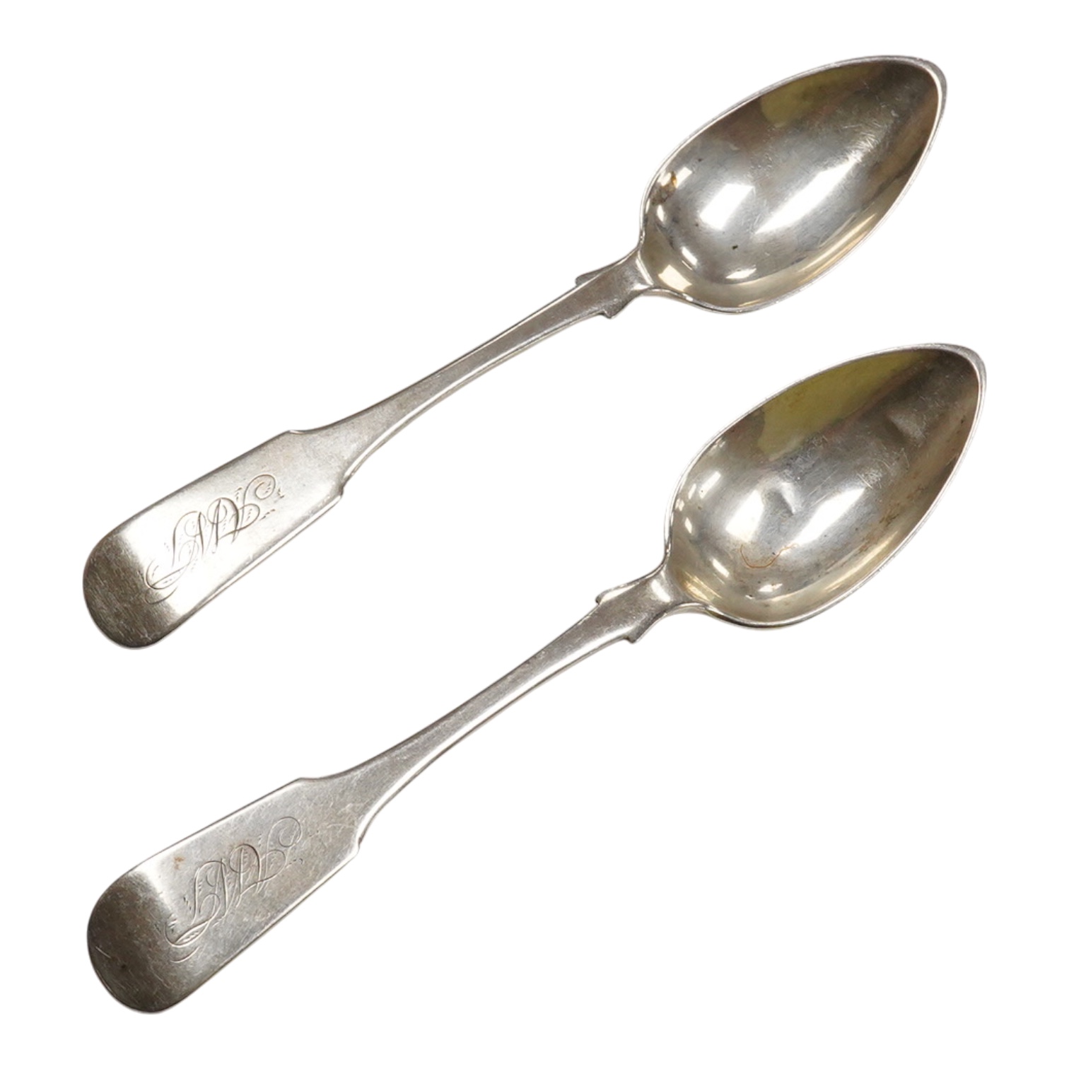 Lot 2843 , A pair of mid 19th century Canadian white metal fiddle pattern teaspoons, with pseudo hallmarks, maker probably William Norris Venning of Saint John, New Brunswick, circa 1850-1870, with engraved initials, 14.5cm, 39 gra