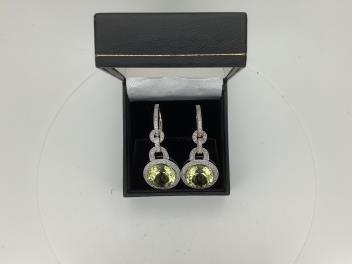 Lot 925 , A pair of modern 18k white metal and single stone circular cut citrine set drop earrings, with diamond chip set border, links and ear wire, drop approximately 41mm, gross weight 11.6 grams, citrine diameter approximately